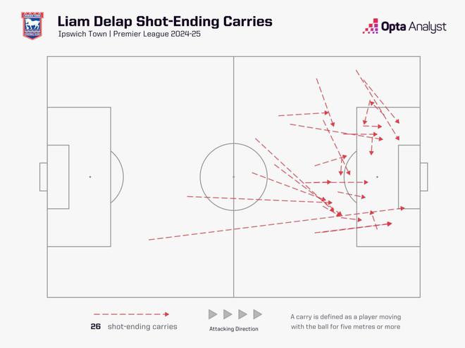 马雷斯卡对德拉普的定位可能会不同于他在伊普斯维奇的角色。后者主要扮演前场支点,仅有水晶宫的马特塔(80次)、狼队的尤尔根-拉森(78次)和南安普顿的奥努阿楚(57次)比他有更多“前场做球”记录。